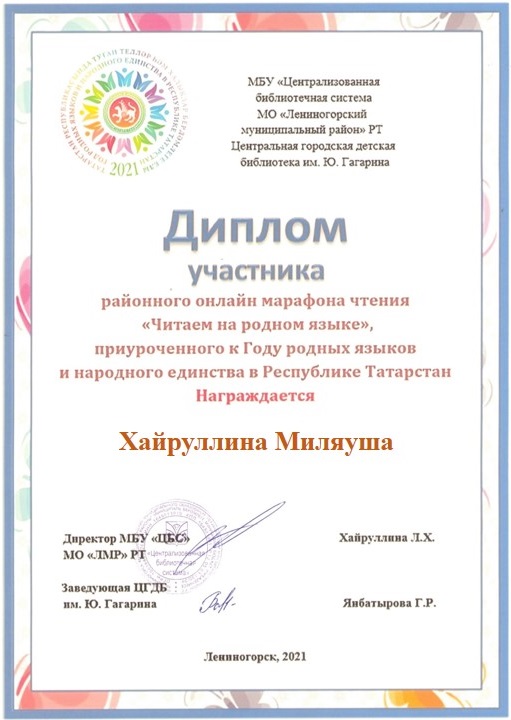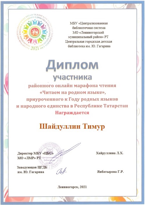 2 нче сыйныф укучылары Хәйруллина М. һәм Шәйдуллин Т. Татарстан Республикасында Туган телләр һәм халыклар бердәмлеге елына багышланган «Туган телдә укыйбыз» дип исемләнгән район онлайн уку марафонында катнаштылар.Учащиеся 2 класса Хайруллина М. и Шайдуллин Т. приняли участие в районном онлайн марафоне чтения «Читаем на родном языке», приуроченное к Году родных языков и народного единства в Республике Татарстан, организованное МКУ «Централизованная библиотечная система» МО «Лениногорский муниципальный район» РТ -