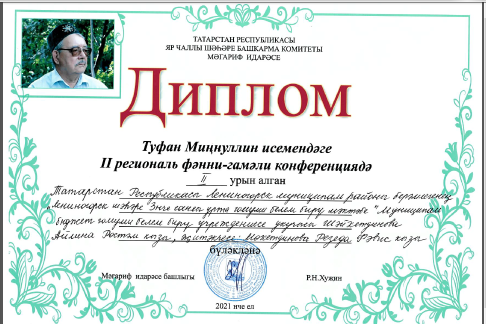Туфан Габдулла улы Миңнуллинның иҗади мирасын киңрәк өйрәнү һәм популярлаштыру максатыннан укучылар, укытучылар, китапханәчеләр өчен Яр Чаллы шәһәренең 29ынчы гимназиясе базасында төбәкара фәнни –гамәли конференция узды. Укытучылар өчен уздырылган юнәлештә татар теле һәм әдәбияты укытучысы Мөхетдинова Р.Ф. беренче урынга, укучылар эшләре юнәлешендә 9нчы сыйныф укучысы Шәйхетдинова А. икенче урынга лаек булды.С целью более широкого изучения и популяризации творческого наследия Туфана Габдулловича Миннуллина, на базе гимназии № 29 г. Набережные Челны для учащихся, учителей, библиотекарей прошла межрегиональная научно –практическая конференция. В работе секции для педагогов - учитель татарского языка и литературы Мухутдинова Р. Ф. заняла первое место, в работе секции учащихся - ученица 9 класса Шайхутдинова А. заняла второе место. -