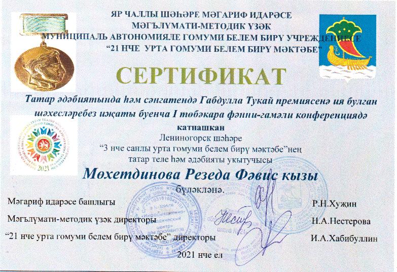 Татар теле һәм әдәбияты укытучысы Мөхетдинова Р.Ф. татар әдәбиятында һәм сәнгатендә Габдулла Тукай премиясенә ия булган шәхесләребез иҗаты буенча I төбәкара фәнни-гамәли конференциядә катнашты.Учитель родного (татарского) языка и литературы Мухутдинова Р.Ф. принимала участие в межрегиональной научно - практической конференции по творчеству лауреатов премии Габдуллы Тукая в татарской литературе и искусстве. -