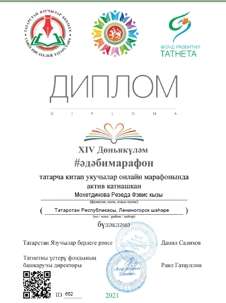 2021 елның 1 гыйнвары көнне XIV #ӘДӘБИМАРАФОН башланып китте. Ул яңа шигарь - #МИНМИЛЛӘТКИЛӘЧӘГЕ девизы астында үтте. Әдәби марафоннның монысы - аеруча үзенчәлекле. Ул - Татарстанда туган телләр һәм халыклар бердәмлеге елына багышланды. Татар теле һәм әдәбияты укытучысы Мөхетдинова Р.Ф. әдәби марафонда катнашып, финалист булды.1 января 2021 года стартовал XIV литературный марафон. Он прошел под новым лозунгом - #МИНМИЛЛӘТКИЛӘЧӘГЕ. Этот литературный марафон-особенный. Он был посвящен Году родных языков и народного единства в Татарстане. Учитель татарского языка и литературы Мухутдинова Р. Ф. приняла участие в литературном марафоне и стала финалисткой. -