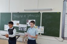 С 06.12.2021 года в школе началась неделя "Русского языка и литературы". В 7 "А" классе ученики, под руководством учителя Шагиевой Г.Ф., провели викторину по русскому языку "Умники и умницы". Класс поделился на 2 команды: "Звёздочки" и "Дружба". Ребята отвечали на каверзные вопросы, выполняли различные задания, вспомнили фразеологизмы и поговорки, антонимы и синонимы. В итоге, со счетом 47:39, победила команда мальчиков - "Дружба".