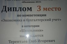 Поздравляем призера V национального чемпионата по профессиональному мастерству среди инвалидов по компетенции "Экономика и бухгалтерский учет" Терентьева Глеба, ученика 11 класса. Желаем творческий успехов.