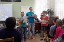 19 июля дети пришкольного лагеря ходили на экскурсию в детскую библиотеку. Там с ними провели викторину. Дети с удовольствием отвечали на вопросы, отгадывали ребусы. После обеда прошла познавательная деловая игра «Правильно питайся - здоровьем наслаждайся». Говорили о правильном питании, составляли праздничные меню. На спортивном часе играли на свежем воздухе.