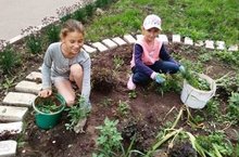 Дети трудового отряда подстригали кусты, убирались на территории школы.
