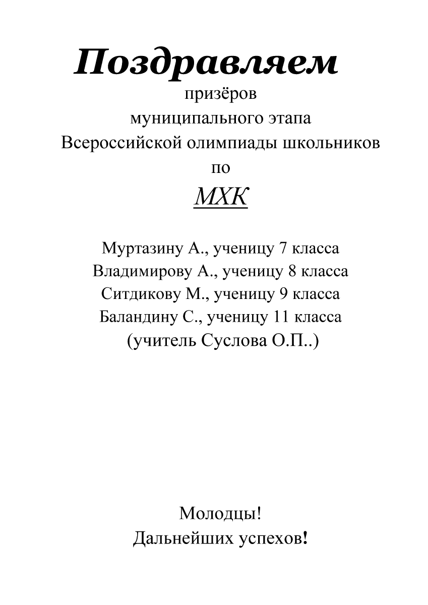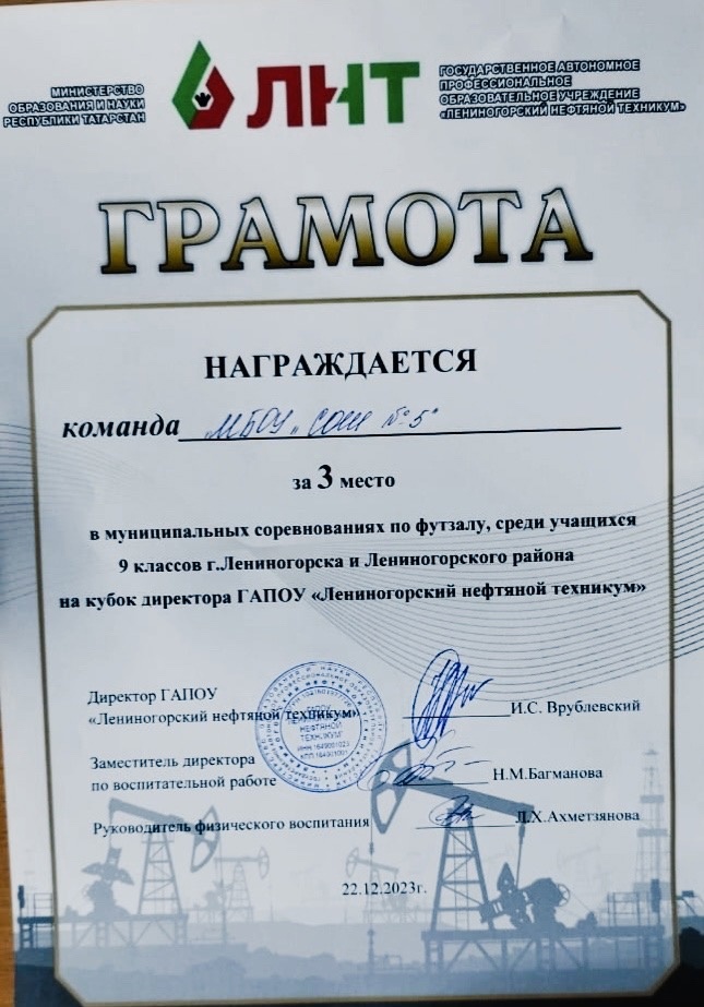 Поздравляем команду нашей школы, занявшую 3 место в муниципальных соревнованиях по футзалу среди учащихся 9-х классов на кубок директора «Лениногорского нефтяного техникума». Так держать! Молодцы!!!