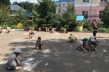 В лагере «Солнышко» день Сказок. Сказочные герои приготовили для ребят викторину «По страницам любимых сказок». Конкурс рисунков на асфальте «Моя любимая сказка» показал, у кого какой любимый сказочный герой.