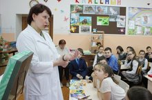 Учащиеся 3б и 3 м классов на практическом занятии .Перед детьми выступил эпидимиолог города.