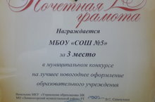 Почетной Грамотой Управления образования награждена школа №5, занявшая 3 место в муниципальном конкурсе на "Лучшее новогоднее оформление образовательного Учреждения".