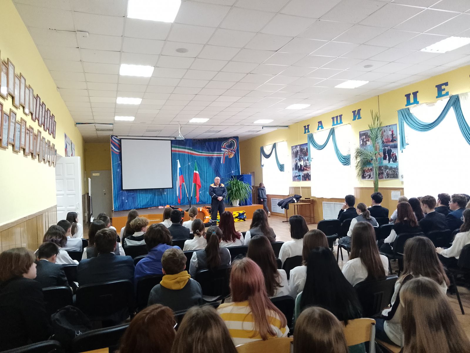 28 ноября 2023г. в стенах школы была проведена встреча спасателей зонально-поискового спасательного отряда №7 с учащимися 8-9 классов. Спасатели Коновалов С.И. и Куликов В.В. провели занятие по предупреждению несчастных случаев на водных объектах в осенне-зимний период. Учащиеся школы узнали, чем опасен осенний и зимний лед, каковы условия безопасного пребывания человека на льду, чем опасно попадание человека под лед и что делать, если ты сам попал в беду, повторили алгоритм действий при спасении человека, провалившегося под лед. Ребята увидели, каким снаряжением пользуются спасатели: спасательный круг, спасательный линь, жилет, гидрокостюм, спасательная доска. Учащиеся 8-9 классов пришли к выводу, что беду легче предупредить, чем ликвидировать ее последствия. Несчастного случая не произойдет, если строго соблюдать правила поведения на водоёме!
