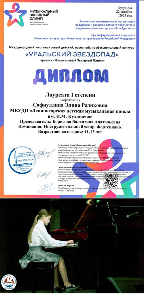 Лениногорск. Стипендиаткой главы города для участников художественной самодеятельности, учреждения культуры и учащихся дополнительного образования стала ученица 7 класса Сафиуллина Элина.
