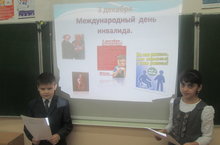 В рамках Международного дня инвалидов 4 декабря в 4Б классе ( кл.рук. Фролова О.П.) прошёл классный час «Сильные духом». Ребята прослушали историю о сестрах Резахановых Зите и Гите, которыми был создан Международный фонд помощи детям инвалидам “Сострадание. Право на лучшую жизнь”. Учащиеся говорили о необходи- мости обращать внимание на людей-инвалидов, которые живут рядом с нами и нуждаются в сострадании и милосердии. -