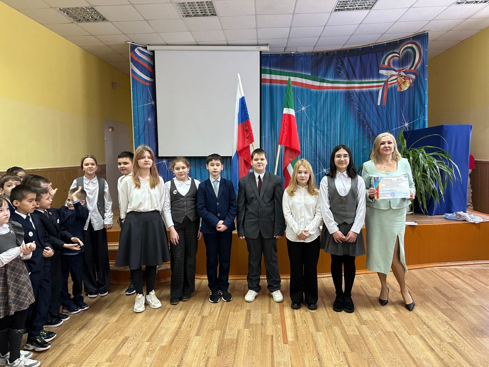 Утро понедельника в школе традиционно началось с торжественной линейки и церемонии вноса государственных флагов Российской Федерации и Республики Татарстан и исполнения государственных гимнов. В торжественной атмосфере прошло награждение победителей различных конкурсов, олимпиад и соревнований. В ходе линейки были подведены итоги прошедшей учебной недели и озвучены планы на наступившую неделю.