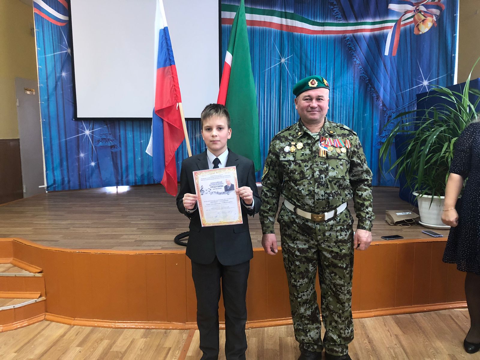Тепло поздравил ребят с посвящением в ряды «Юнармии» представитель РОО Ветеранов Боевых действий и пограничков запаса РТ Камиль Олмасович.