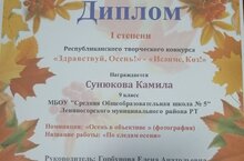 Поздравляем с 1 местом ученицу 9 В класса Сунюкову Камилу! Желаем дальнейших творческих успехов.