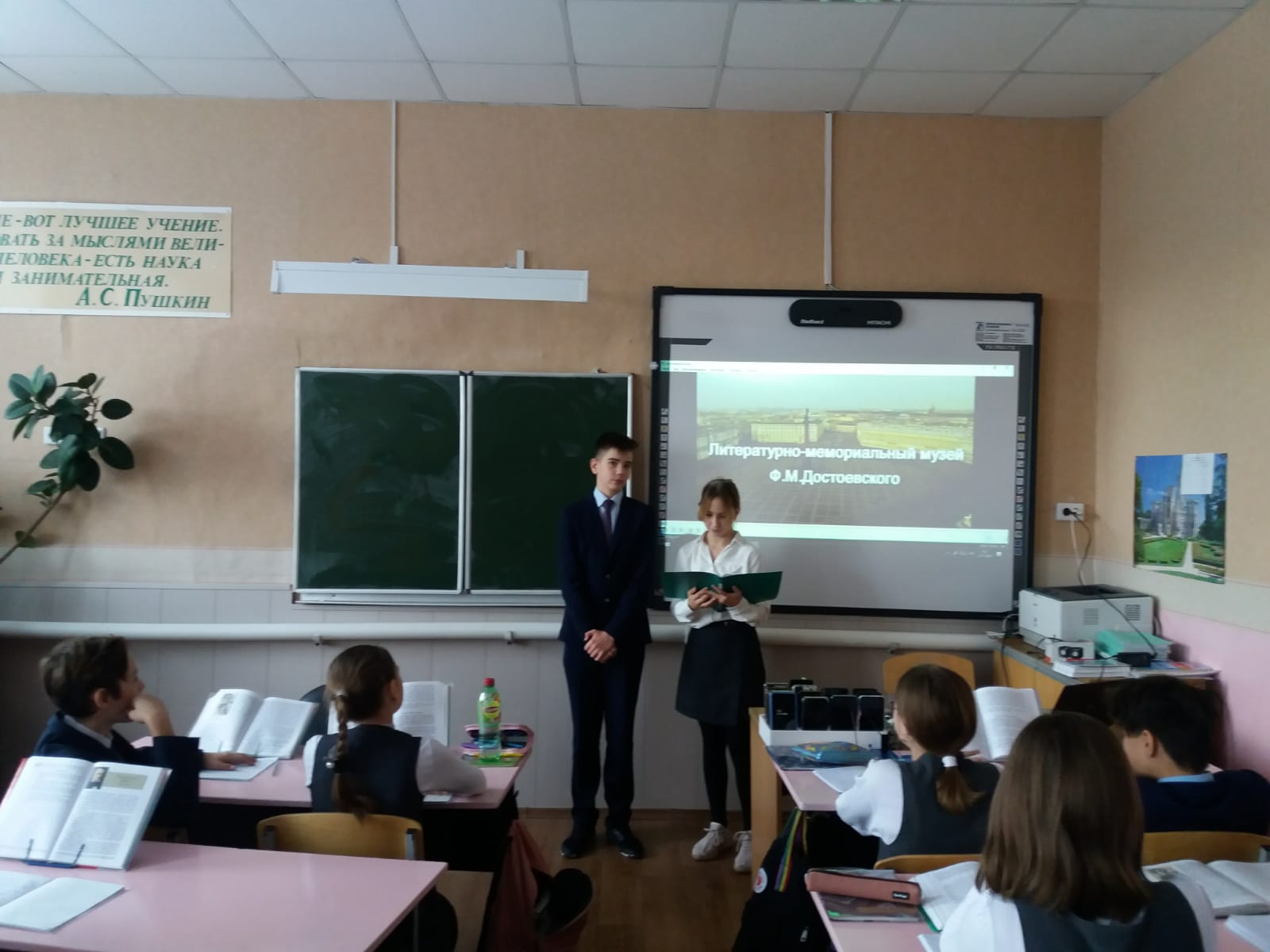 В 6м классе прошло мероприятие, посвященное 200-летию со дня рождения Ф.М. Достоевского. Шестиклассники познакомились с жизнью писателя. Творческая группа подготовила и провела виртуальную экскурсию по литературному мемориальному музею Ф.М.Достоевского.
