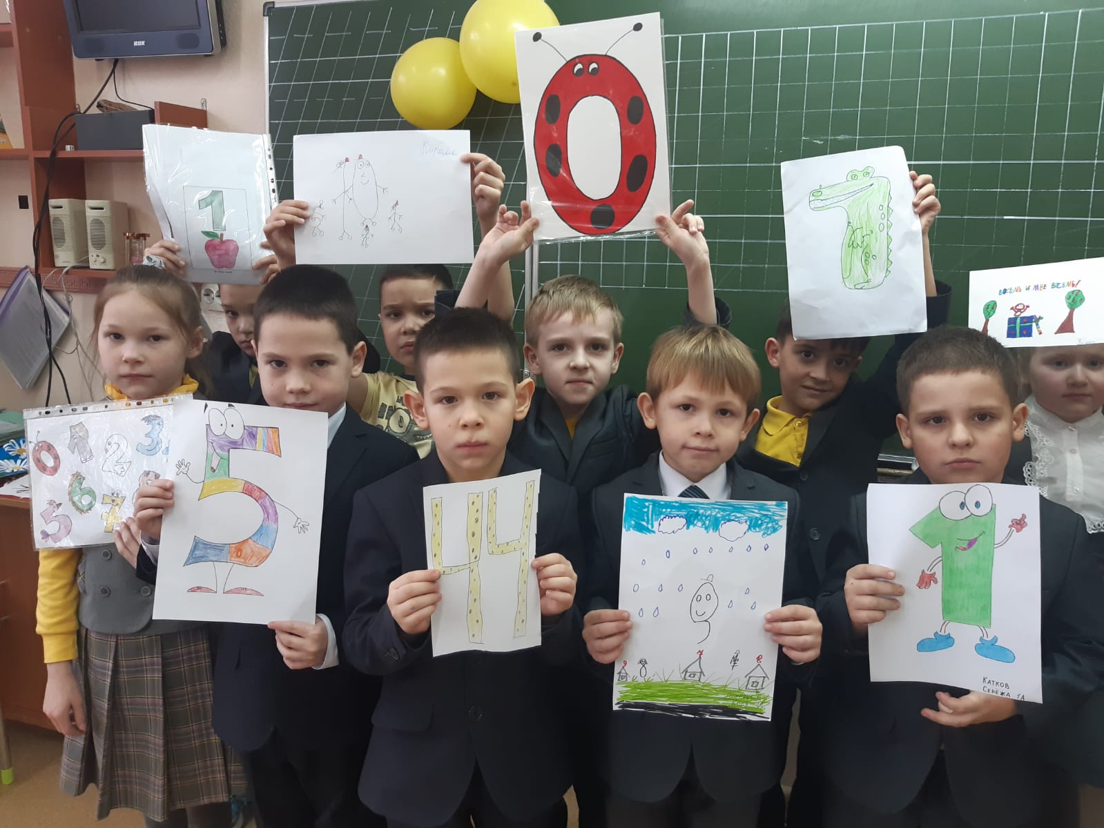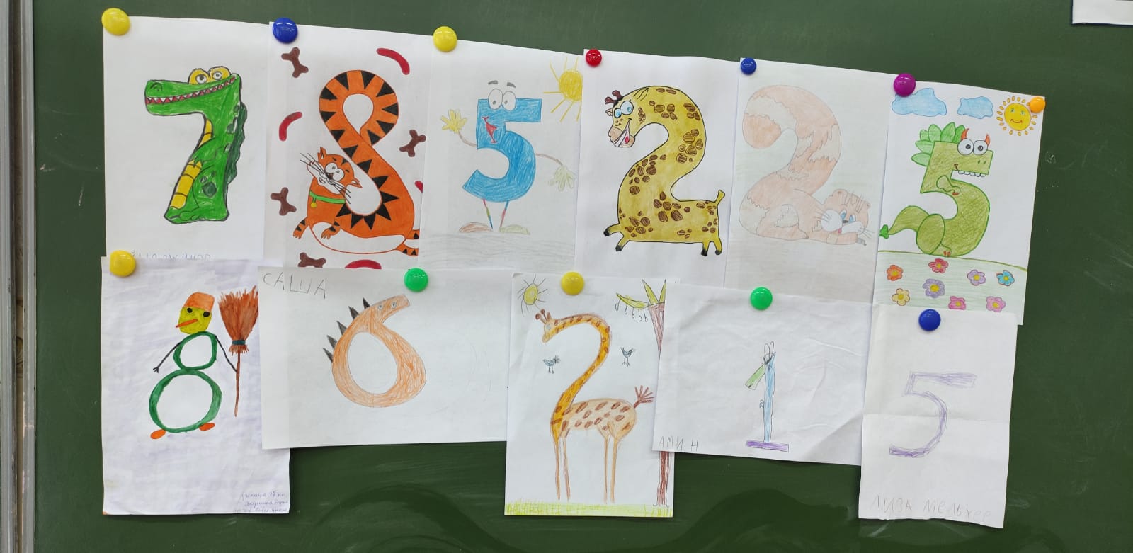 В день математики учащиеся 1 Б класса приняли участие в конкурсе рисунков "Живая цифра"