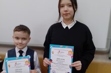 По праву: Сайфутдинову Дину, Константинова Аделя (8 В класс), Слабодину Злату (11 класс).