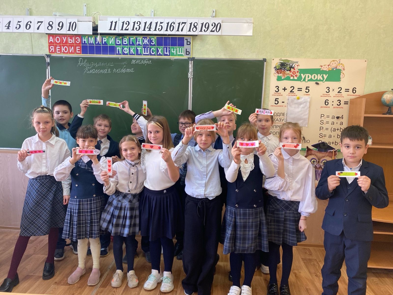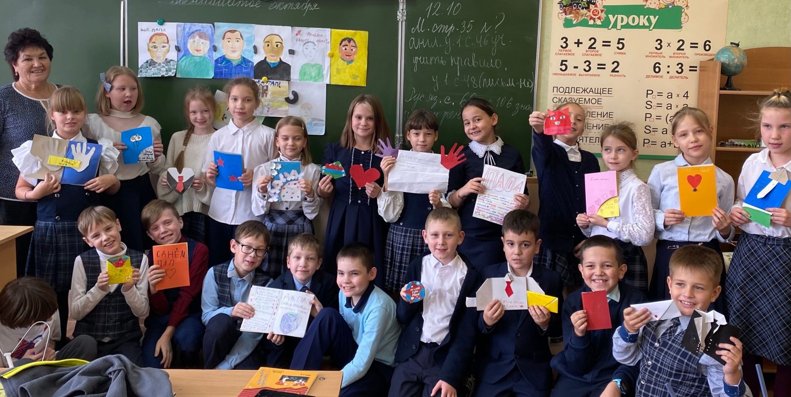 Учащиеся 3 "В" класса под руководством классного руководителя - Хаертдиновой Х. Г., совместно с советником директора по воспитанию и взаимодействию с детскими общественными объединениями - Яковлевой В. В., изготовили своими руками поздравительные открытки, а также нарисовали своих Пап.