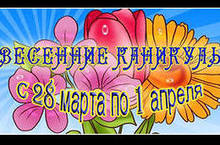 Весенние каникулы продлятся с 25 марта по 1 апреля 2013 года. В этот период для обучающихся 9, 11 -х классов будут организованы курсы по подготовке к ГИА и ЕГЭ, расписание занятий можно уточнить у классных руководителей.