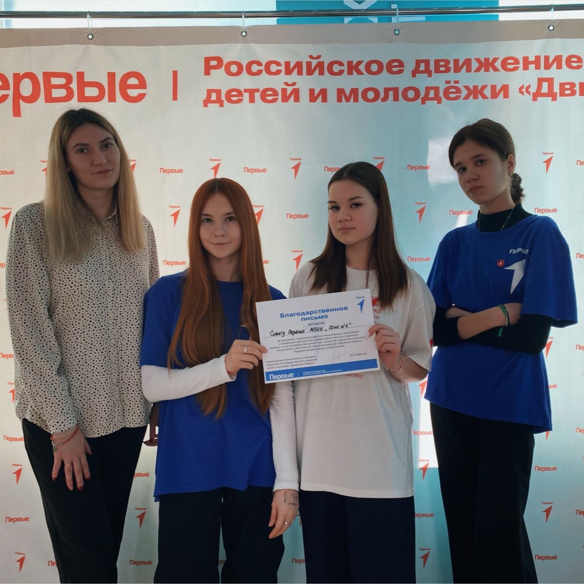 Благодарственным письмом за инициативу, проделанную работу и личный вклад в организацию и проведение мероприятий в рамках работы местного отделения «Движения Первых» был награжден «Совет Первых» МБОУ «СОШ №6», а также благодарственное письмо за вклад в развитие Общероссийского общественно-государственного движения детей и молодежи «Движение Первых» было вручено советнику директора по воспитанию МБОУ «СОШ №6», Яковлевой В. В.