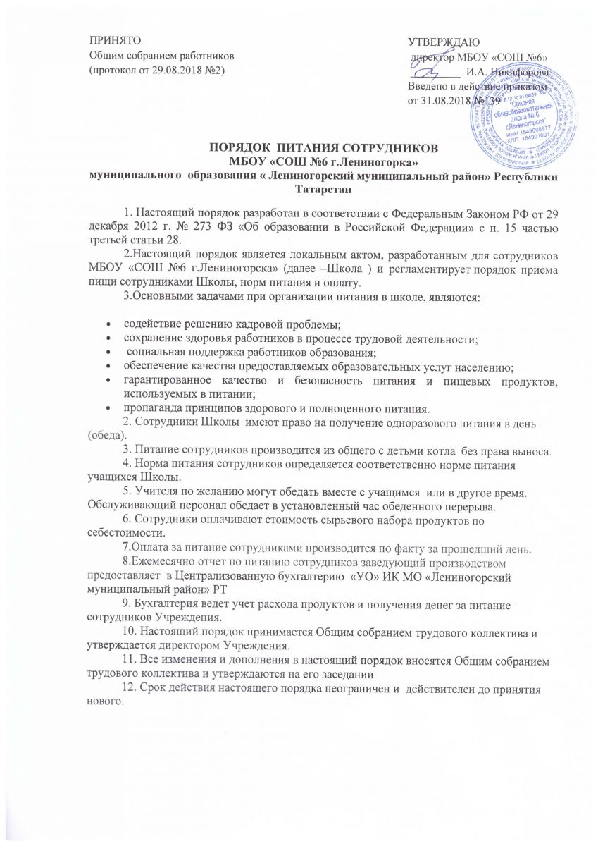 Порядок питания сотрудников МБОУ «СОШ №6»