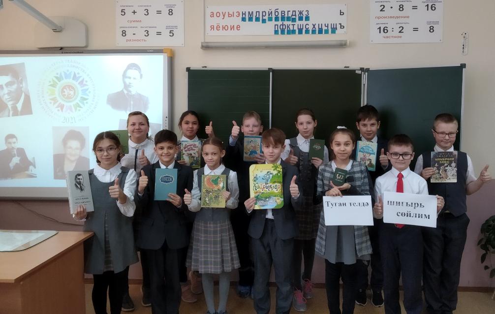 В рамках Года родных языков и народного единства в РТ в 4Б классе прошло мероприятие «Читаем стихи на родном языке». Учащиеся принесли на выставку книги известных татарских поэтов, прочитали их произведения на татарском и на русском языках. Обсудили содержание услышанных стихотворений. Внимание ребят привлекли самые старые, чёрно-белые книги и современные книги, снабжённые дисками с мультфильмами по произведениям, а также самая маленькая книжечка.