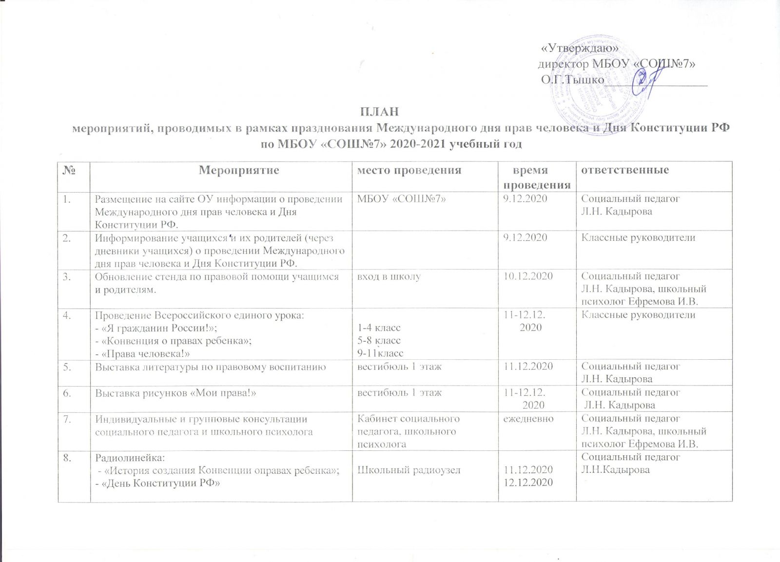 День Героев Отечества в России — это памятная дата, которая отмечается в нашей стране ежегодно 9 декабря. Она установлена Федеральным законом Российской Федерации. В этот день в России чествуют Героев Советского Союза, Героев Российской Федерации и кавалеров ордена Святого Георгия и ордена Славы. Героями не рождаются, героями становятся в час испытаний. В каждую эпоху есть свои герои – люди, которые отважно защищали свое Отечество, внесли огромный вклад в историю своей страны. Люди, которые совершили подвиг, многие из них пожертвовали своей жизнью во благо Родины. 9 декабря в школе прошли уроки мужества, посвященные Дню героя Отечества. На уроках ребята вспоминали героев земли Российской: А. Невского, Д. Донского, К. Минина и Д. Пожарского, А. В. Суворова, М. И. Кутузова, Г. К. Жукова и славных сынов Отечества нашей современности: А. Прохоренко, М. Нурбагандов, В. Чуркин, А. Карлов, 6 рота 104 полка 76-й Псковской дивизии ВДВ, Р.Филиппов, Д. Портняжкин. В мероприятиях приняли участие учащиеся: Краснова К.С., Смоленков К.П., Бортников В.Д. - ПЛАН мероприятий, проводимых в рамках празднования Международного дня прав человека и Дня Конституции РФ по МБОУ «СОШ №7» 2020-2021 учебный год 09.12.2020