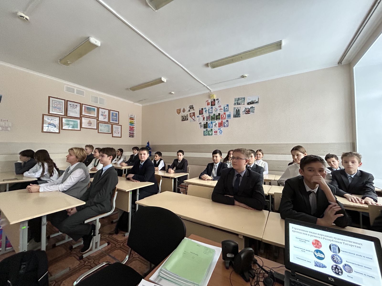 В целях формирования представлений о важности сохранения и развития духовных ценностей народов, населяющих Республику Татарстан, в 9Б классе было проведен классный час на тему: «Народные художественные промыслы и декоративно-прикладное искусство Республики Татарстан». Учащиеся познакомились с понятиями «художественное ремесло», «народный художественный промысел», «декоративно-прикладное искусство», узнали о многообразии существующих видов «народного искусства» на территории России.