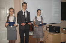 Творческая команда 7-8 классов под руководством учителей музыки провели исследовательскую работу по изучению жизненного и творческого пути советского композитора В.П.Соловьева-Седова к 110-летию со дня рождения. Ребята не только собирали и изучали материал о композиторе, но и организовали деятельность среди одноклассников под названием "Послушай и нарисуй". Таким образом у нас появилась целая картинная галерея - художественное видение известных песен В.П.Соловьева-Седова. Представители от группы (см. фото) достойно защитили проект на муниципальном конкурсе проектов "Музыка сегодня" на базе СОШ № 10 и заняли 2 место. Молодцы!