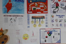 Оформлена школьная выставка творческих работ по теме "Виды спорта"