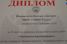 Ученица 5 Б класса, член кружка «Юный музеевед», Власова Анастасия (учитель Горшенина Н.М.), заняла в ней 2 место и была награждена дипломом и денежным сертификатом. Поздравляем с победой! Молодец!