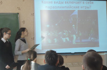 На основании письма МОиН РТ № 14746/13 от 23.10.2013 г. «О проведении паралимпийского урока». Учащимися 7А класса Лапаскиной Ольгой и Галеевой Ксенией были проведены Всероссийские паралимпийские уроки в 5-х классах. Они показали презентацию и рассказали об истории создания паралимпийских игр, где, когда и в каком году их начали проводить и проводят сейчас. Символами паралимпийских игр стали Лучик и Снежинка. По 23 видам спорта проводятся соревнования: стрельба из лука, легкая и тяжелая атлетика, фехтование, плавание, настольный теннис, волейбол, лыжные гонки, биатлон и др. Очень интересным был рассказ о наших земляках-спротсменах Марте Зайнуллиной, Рамиле Илалутдинове и Ирине Поляковой.