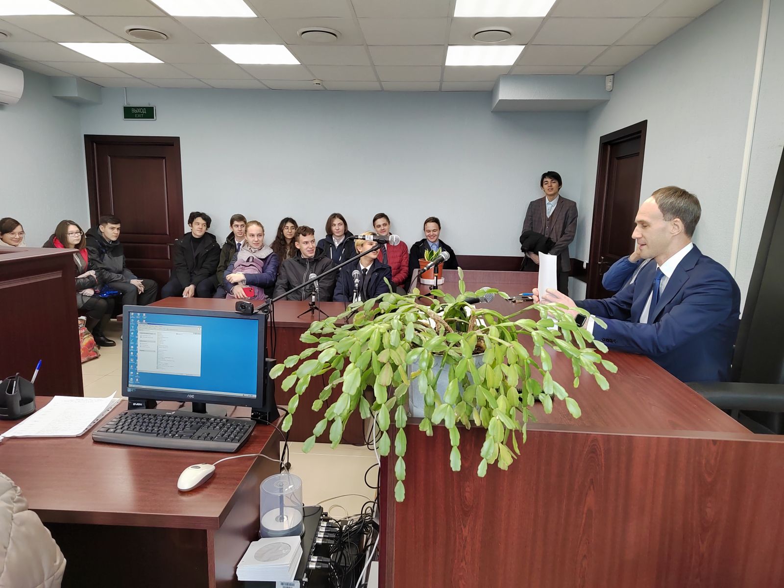 27 октября 2022 года учащиеся 10 класса с учителем истории и обществознания посетили Лениногорский городской суд Республики Татарстан. Заместитель председателя суда А.Е.Борисова провела со школьниками экскурсию, начав ее с холла здания суда, где судебные приставы по обеспечению установленного порядка деятельности судов познакомили их с постом охраны и правилами пропускного режима. Она рассказала ребятам структуру Лениногорского городского суда, подробно остановилась на деятельности, категориях дел, рассматриваемых городским судом и мировыми судьями судебных участков, используемых судом современных технологиях, таких как видеоконференц-связь и комплекс аудиопротоколирования, полномочиях судьи и требованиях, предъявляемых к кандидатам на должность судьи.