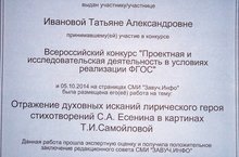 Поздравляем Татьяну Александровну Иванову, учителя русского языка и литературы, с успешным участием во Всероссийском конкурсе "Проектная и исследовательская деятельность в условиях реализации ФГОС". Работа Татьяны Александровны на тему : "Отражение духовных исканий лирического героя стихотворений С.А.Есенина в картинах Т.И.Самойловой" прошла эксперную оценку, получила положительное заключение редакционного совета и 5.10.2014 была размещена на страницах СМИ "Завуч. Инфо".