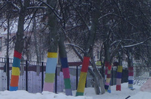 Зимняя сказка... 19.12.2013 Зимой деревья не отличаются особой яркостью. И в преддверии Нового 2014 года, члены Совета Старшеклассников средней школы № 8 решили изменить эту тенденцию и решили одеть деревья на пришкольной территории в теплые, яркие шарфы. Инициативу поддержали, как учителя, так и родители. Учащиеся 1 - 5 классов и их родители с удовольствием делали заготовки для "одёжки", а старшеклассники укутывали деревья в тёплые, красивые шарфы. И вот пришкольный дворик стал разноцветным и привлекающим всеобщее внимание прохожих и жителей микрорайона.