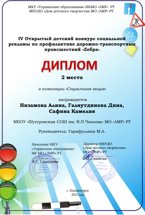 Учащиеся нашей школы, члены отряда ЮИД под руководством Гарифуллиной М.А. приняли участие в IV Открытом детском конкурсе социальной рекламы по профилактике ДТП «Zебра». Цель данного мероприятия:предоставить детям возможность выразить свое отношение к проблеме дорожно - транспортных происшествий и внести свой вклад в развитие социальной рекламы. В номинации «Социальная реклама» работа учащихся заняла 2 место. Конкурсная работа поможет учащимся 5 классов в подготовке к конкурсу «Безопасное колесо».