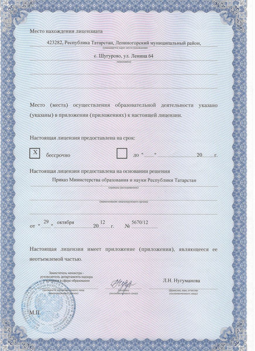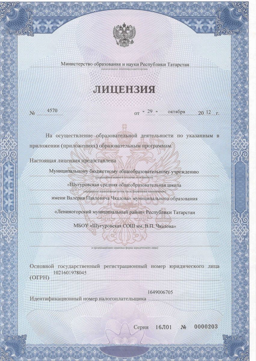 Лицензия 16Л01 № 0000203, регистрационный номер 4570, дата выдачи: 29.10.2012, настоящая лицензия представлена на срок: бессрочно, на основании решения Приказа Министрества образования и науки Республики Татарстан от 29 октября 2012 г №5670/12. Приложение серия 16П01 № 0000232