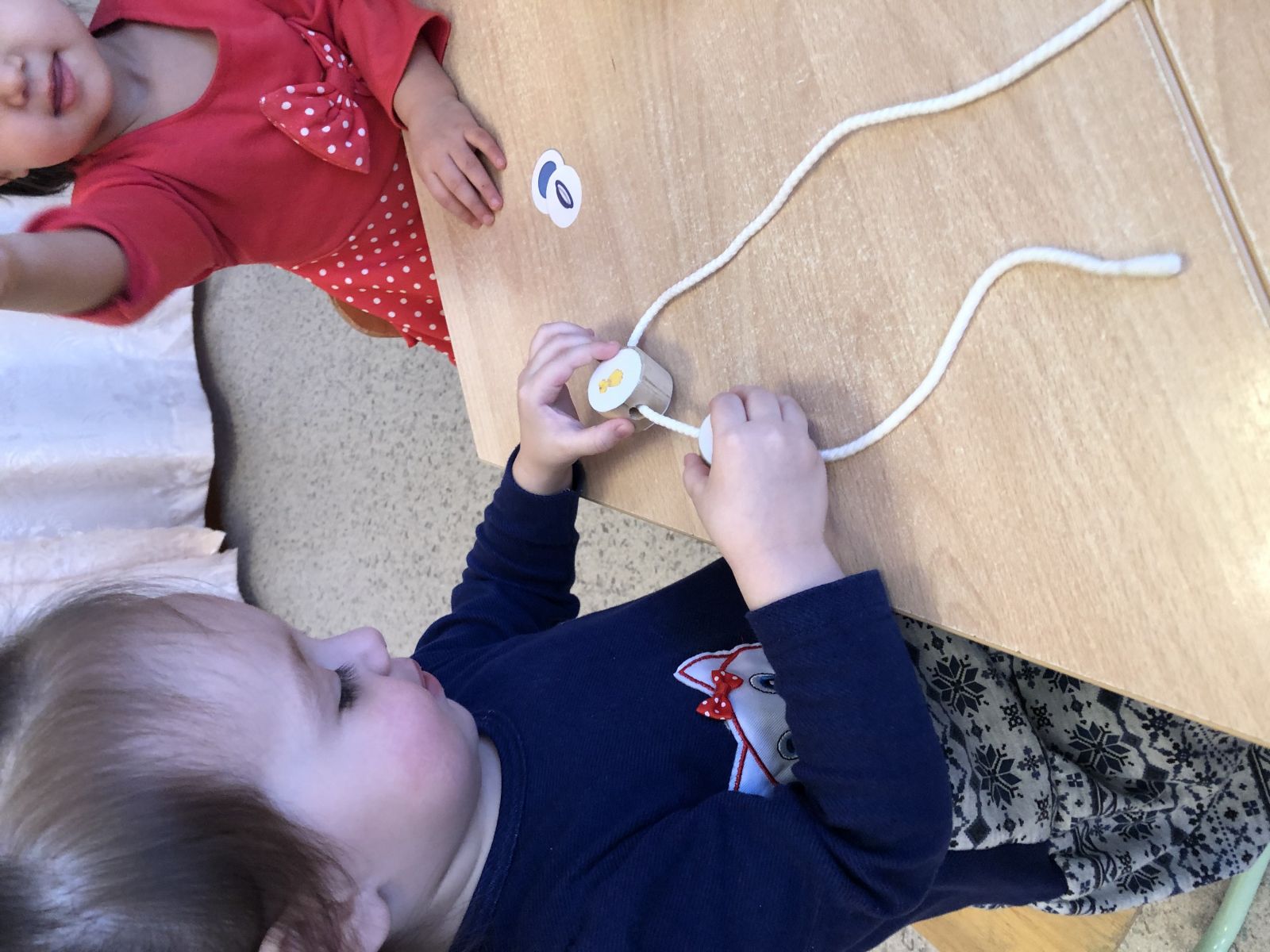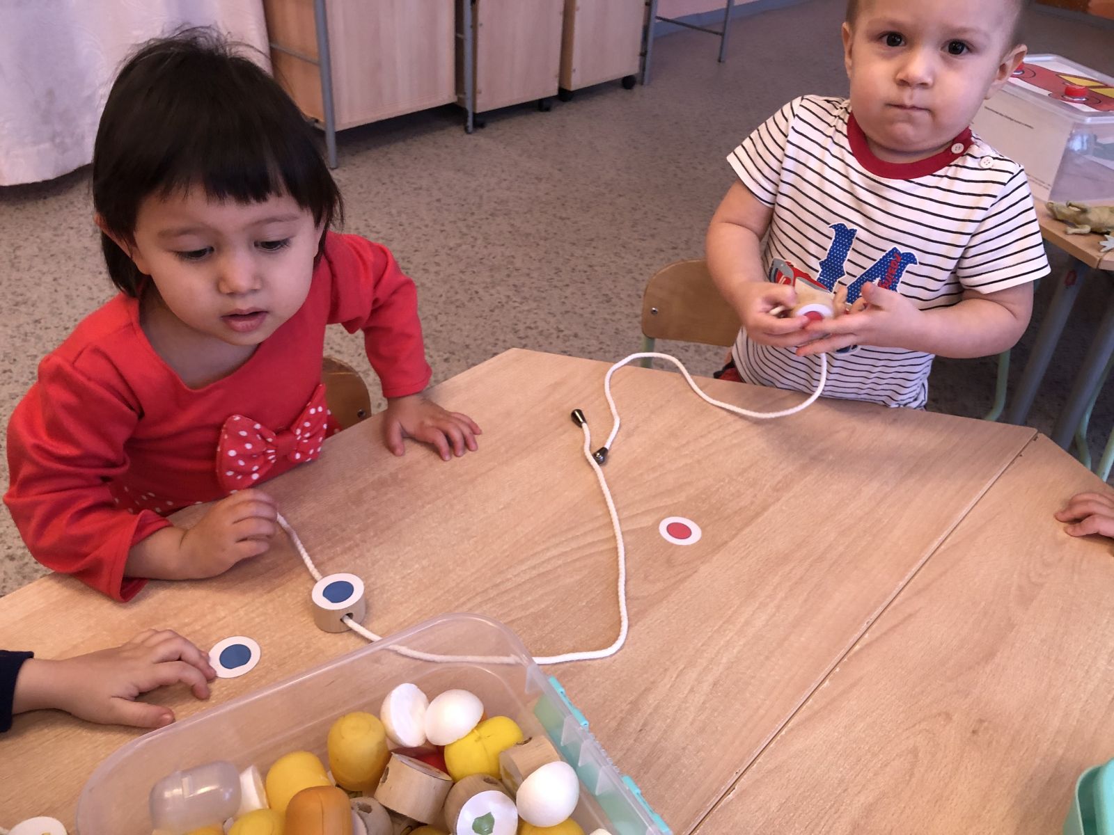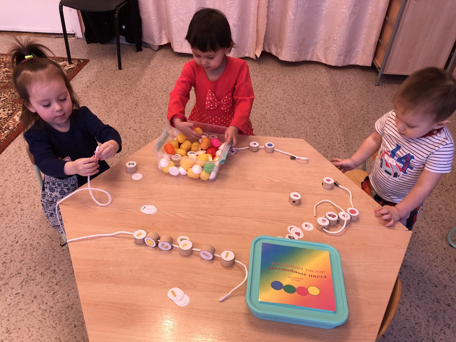 Ход игры: Участвуют 4 ребенка. Воспитатель берет по одной предметной картинке и называет что на ней изображено. Если цвет изображения совпадаетс цветом карты, то игрок находит того же цвета и пронизываает на шнур. Воспитатель задает вопросы: "Это что?", "Какой". Дети называю. Таким образом, заполняют шнур. Игра продолжается до тех пор, пока не закончатся круги на столе.