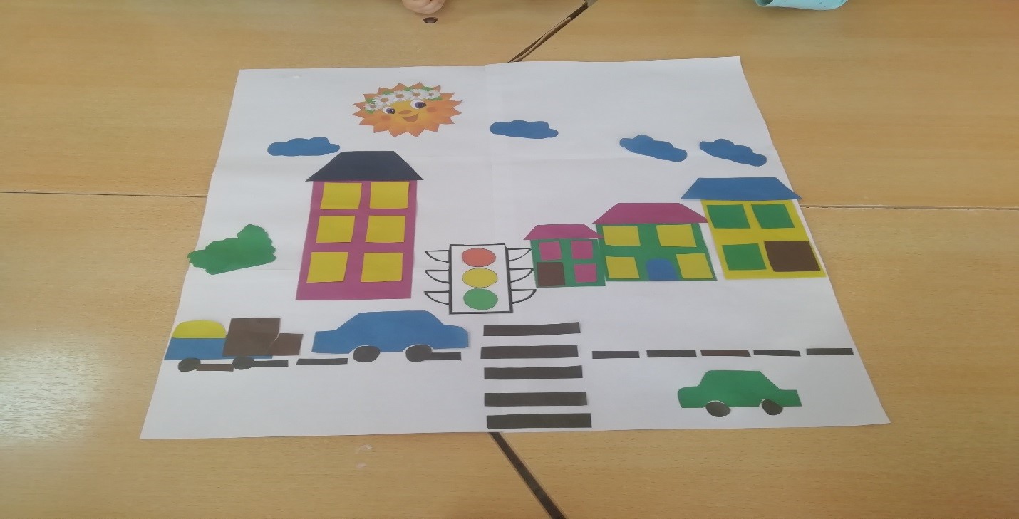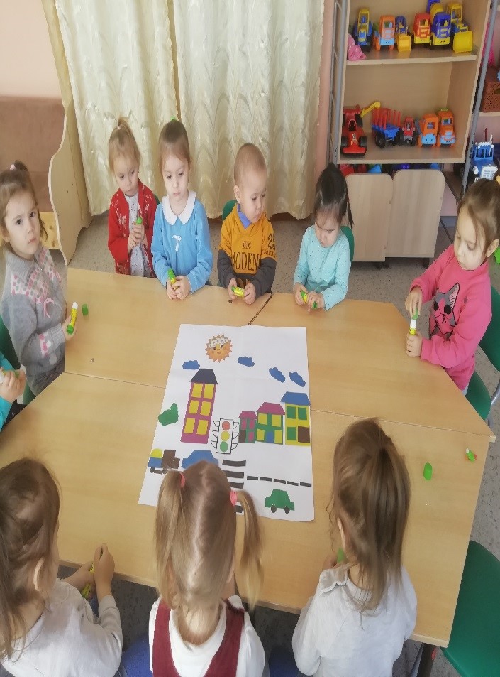 Коллективная работа в первой младшей группе "Машины едут по улице" (аппликация). 18.11.2020