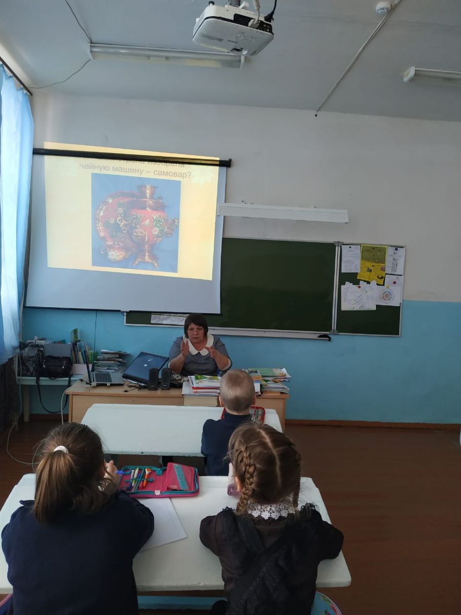 Һәр халыкның үз милли сувениры, символы, милли байлыгы бар. Рус халкының - матрешка һәм самовар .5 март көнне без укучылар белән самовар турында читтән торып экскурсия үткәрдек, аның барлыкка килү тарихы белән таныштык . Рус самовары уникаль, ул рус мәдәниятенең бер өлешенә әверелде. Самовар җәмгыятьтә төрле катламнар арасында бәйләүче буын була. Аны аристократ өстәлендә дә, гади эшче кеше йортында да, трактирда да, чәйханәдә дә күрергә була иде. Самовар ике гасыр дәвамында рус көнкүрешен гәүдәләндергән. Аннан башка бер генә гаилә Советы да читтә калмады, чәй табыны артында җитди мәсьәләләр, эшлекле алыш-бирешләр һәм иҗади эзләнүләр хәл ителде. Балалар самовар турында бик күп яңалыклар белделәр. Материалны ныгыту өчен «Нәрсә ул самовар? " дигән викторина үткәрделәр. Укучылар самовар турында гына түгел, ә сәнгать әдәбиятын уку өлкәсендә дә үзләренең белемнәрен күрсәттеләр.