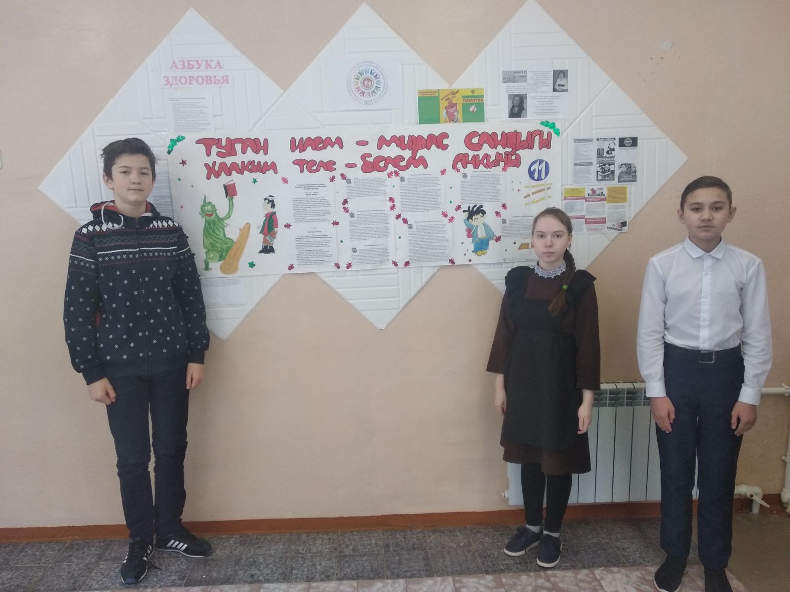 В честь празднования Международного дня Родного языка в школе был объявлен конкурс на лучший плакат о языках и конкурс рисунков по произведениям Г Тукая , М Джалиля. Цель этого мероприятия- углубление и закрепление знаний о родном языке, формирование умений находить знания и презентовать свои работы. Сегодня был подведен итог. Самыми активными участниками были учащиеся начальных классов, победителями конкурса стали учащиеся 6, 8 классов Мусатзанова А., Саитов Р., Вильданов Р.. Они вместе выпустили газету « Туган илем- мирас сандыгы, халкым теле- белем ачкычы».