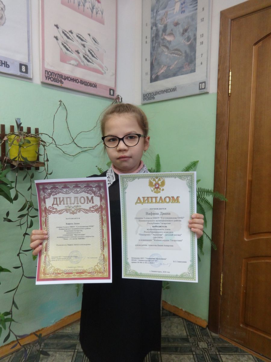 Сугышлы мәктәбенең 4 сыйныф укучысы Вафина Диана үзенең активлыгы белән аерылып тора: район күләмендә үткәрелгән олимпиадаларда, конкурсларда, конференцияләрдә призлы урыннар алып килә. Матур җырлый, бии һәм рәсем ясый. Шушы көннәрдә Диана ике Диплом белән бүләкләнде. Аның берсе “Нацпроект «Экология – детский взгляд» дип аталган республика конкурсының муниципаль этабында “Татарстанның яшел йөрәге” номинациясендә (рәсем) җиңүче булды (куратор Әхмәтова Ф.А.) Яшь эколог табигатьне өйрәнү һәм саклау эшендә дә актив катнашып килә.