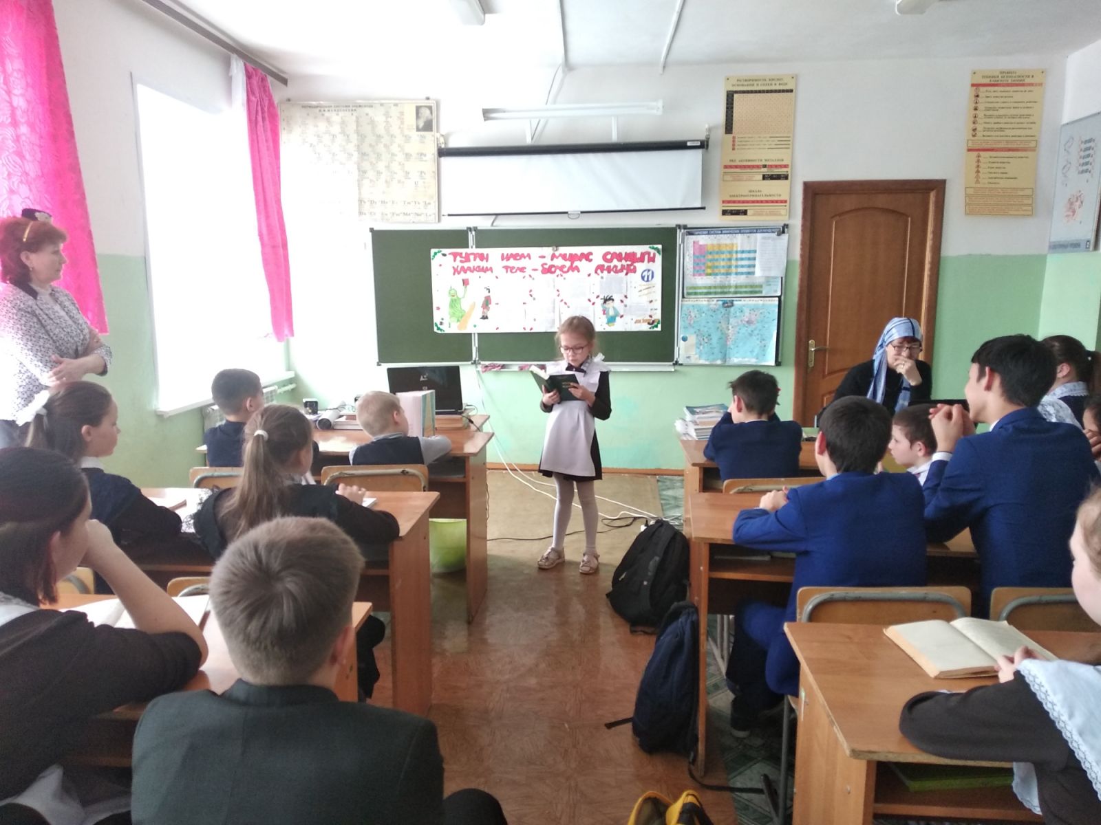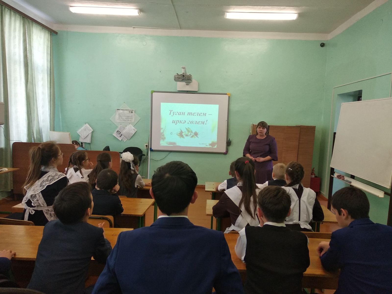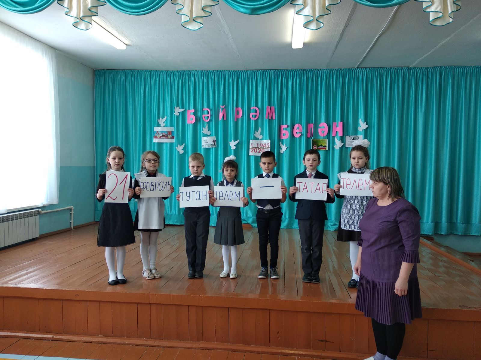 21 февраль көнне мәктәбебездә Туган тел көне билгеләп үтелде. Башлангыч сыйныф укытучысы Фәсхетдинова Ф.Ф. укучыларны татар теле тарихы белән таныштырды, презентация күрсәтелде. Әлеге чараны укучылар татар теленең Гимны булып саналган "Туган тел" җырын башкарып тәмамладылар.