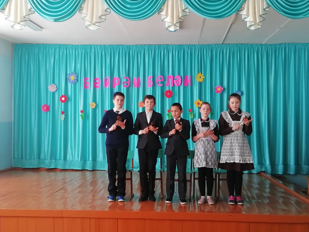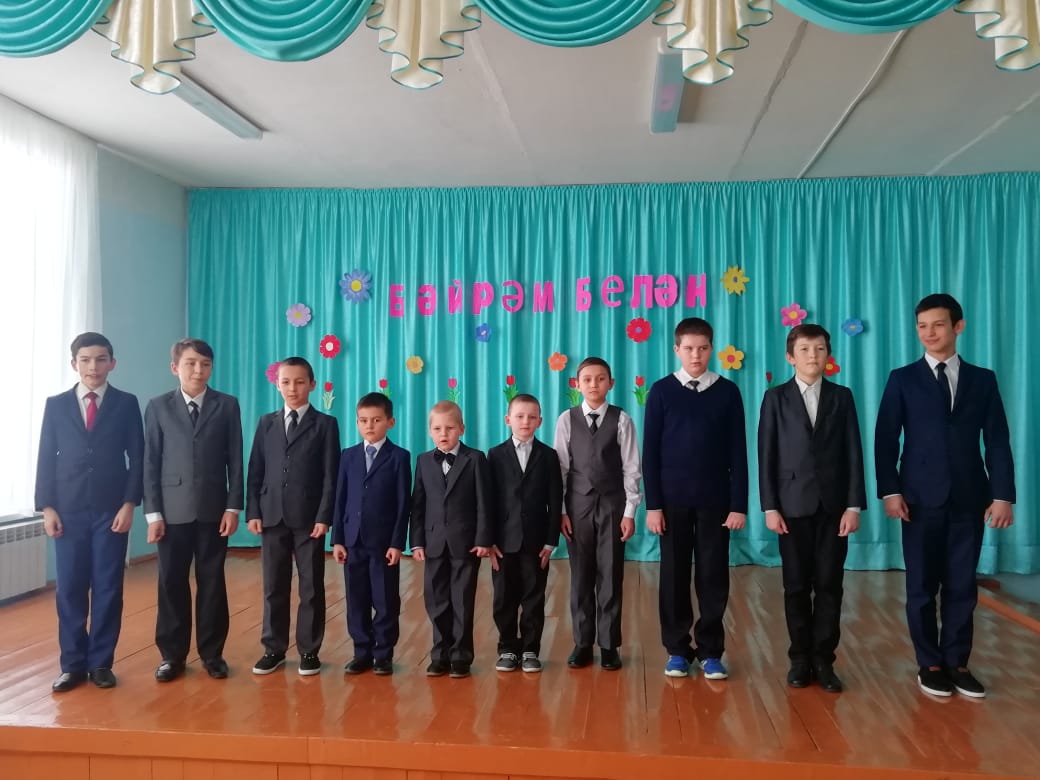 Бүген мәктәбебез егетләре катнашында 8 Март бәйрәменә багышланган бәйрәм чыгышы күрсәтелде.Егетләр апаларны, кызларны котлап, матур шигырьләр һәм җыр-биюләр күрсәттеләр. Рәхмәт аларга.