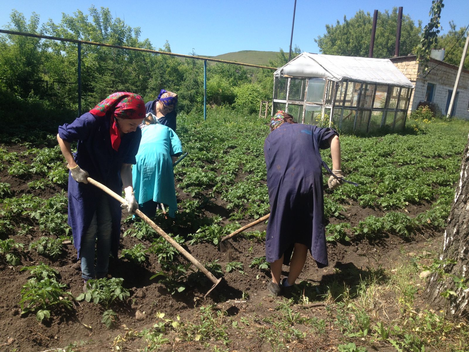 Дети лагеря труда и отдыха убирали территорию школы, очищали асфальт от травы и камней. Поливали цветы и овощи, окучивали картофель.