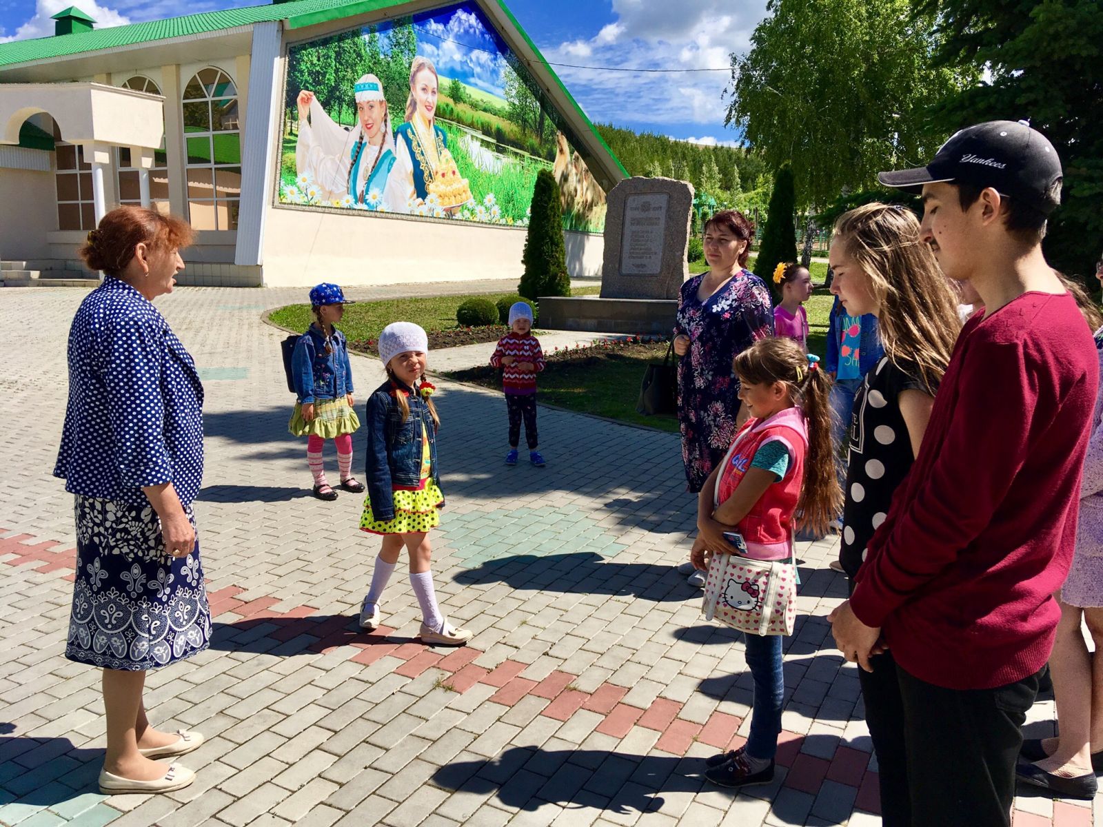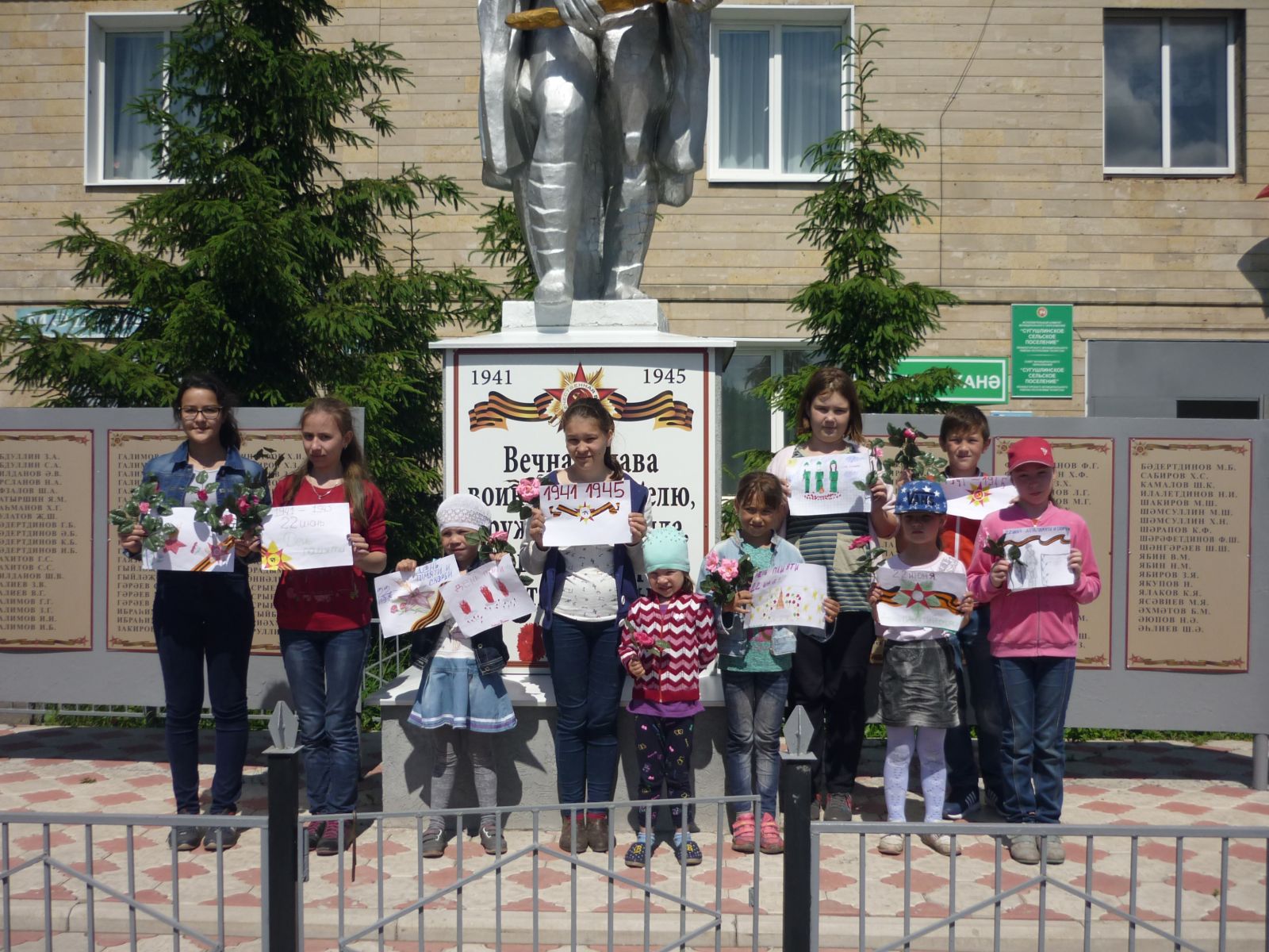 После завтрака ребята вместе с воспитателями отправились к памятнику неизвестному солдату для возложения цветов. Далее мероприятия продолжились в клубе. Худ.руководитель Сугушлинского СДК Галимова С.М. и библиотекарь сельской библиотеки Вафина М.К. рассказали детям о трагических днях Великой Отечественной войны, о ее начале, о героях-земляках. Библиотекарь прочитала несколько стихотворений о войне.