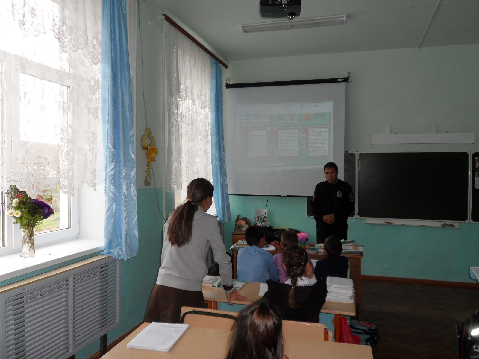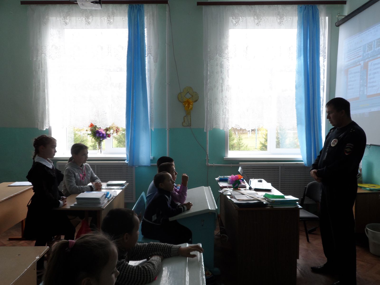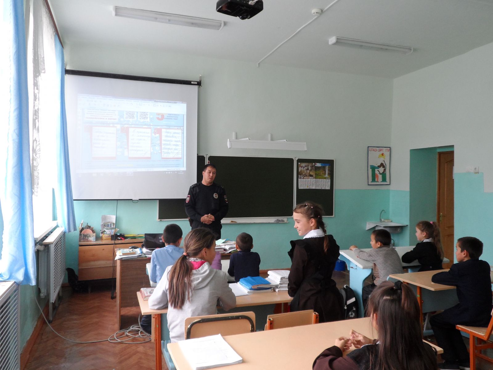 В рамках Всероссийской акции «Твоя пятерка безопасности» в школе была организована тематическая встреча с участковым инспектором А.С.Коноваловым. В ходе мероприятия участковый инспектор разъяснил учащимся начального и среднего звена школы о пяти правилах безопасного поведения,раздал памятки МВД России "Пятерка безопасности".Встреча прошла в теплой атмосфере. В игровой и интересной форме полицейский довел до ребят все правила безопасного поведения в быту и на улице.