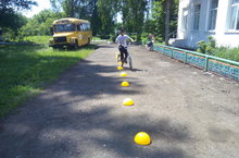 В рамках акции "Внимание дети!" с детьми пришкольного лагеря был проведен конкурс "Юный велосипедист". Ребята объезжали препятствия на велосипеде.