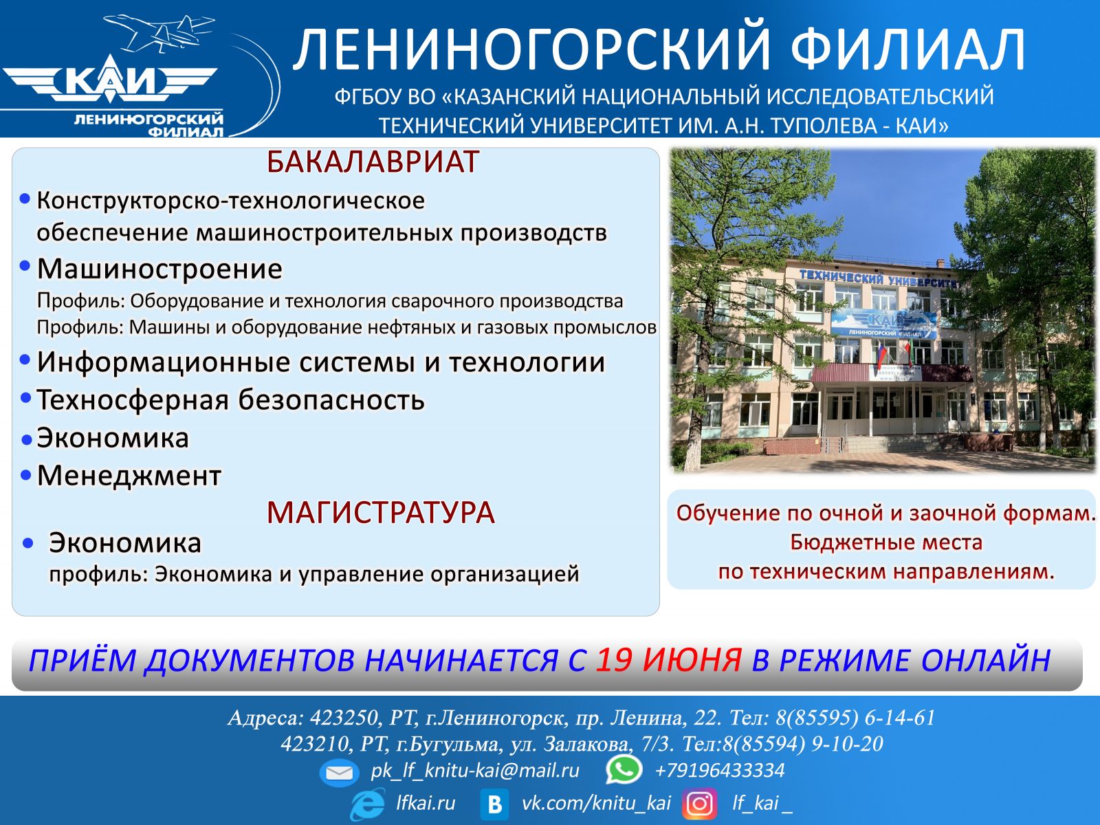 Опубликовано: 23.06.2020Лениногорский филиал КНИТУ-КАИ приглашает абитуриентов на обучение.