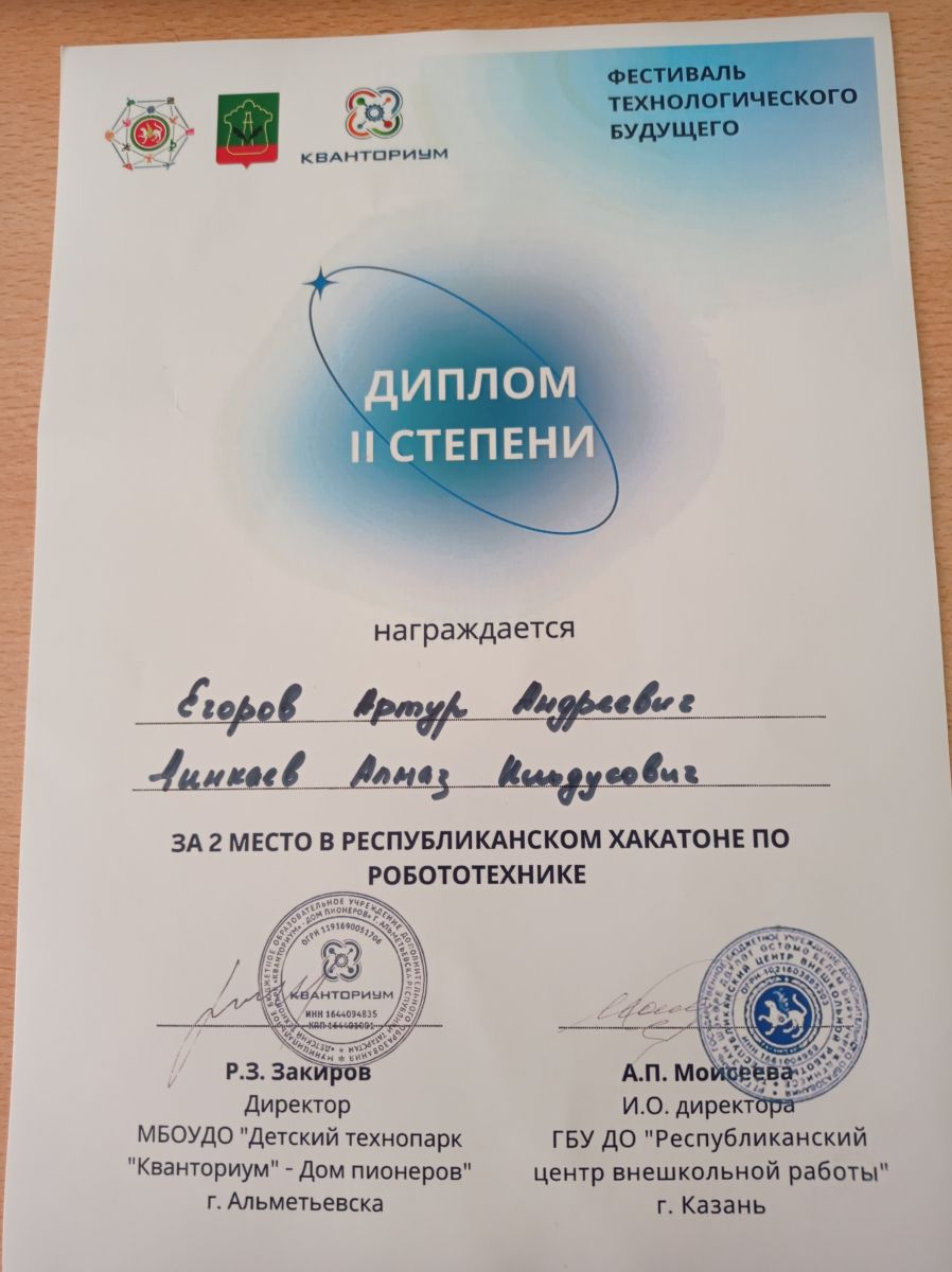 Учащиеся МБОУ "Тимяшевская СОШ" Егоров А.А. и Динкаев А.И. приняли участие в хакатоне по робототехнике и заняли 2 место. Награждены дипломом II степени.